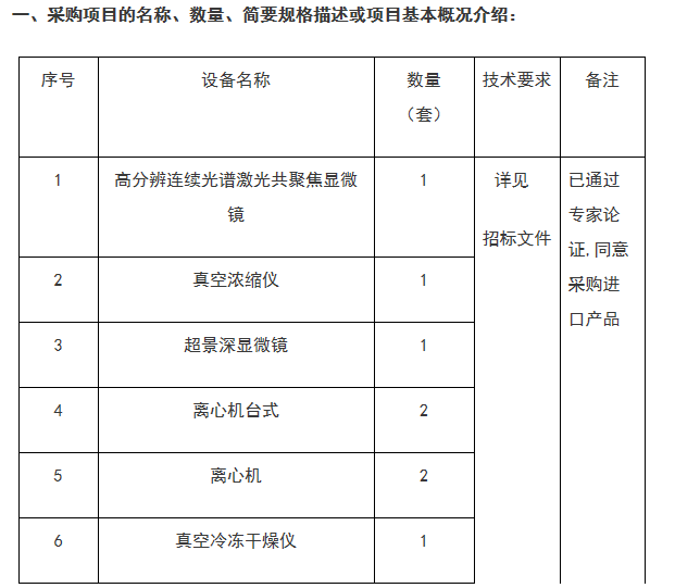 根据上述采购列表,此次采购的仪器设备包括高分辨连续光谱激光共聚焦显微镜、真空浓缩仪、超景深显微镜、离心机台式、离心机以及真空冷冻干燥仪。其中,离心机是是利用离心力,分离液体与固体颗粒或液体与液体的混合物中各组分的机械。该机械主要用于将悬浮液中的固体颗粒与液体分开,或将乳浊液中两种密度不同,又互不相溶的液体分开,此外,它还可以用于排除湿固体中的液体。目前,离心机应用的领域主要有化工、石油、食品、制药、选矿、煤炭、水处理和船舶等,应用领域较为广泛。