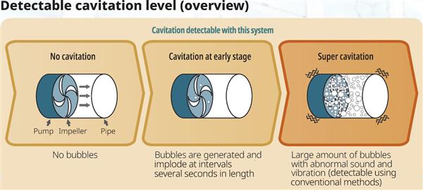 流体中的气蚀会导致泵损坏。为了最大限度地减少这种损害,有必要在早期阶段检测气蚀并采取如调整流量等措施。但气蚀现象是在设备内部发生的,不能目测检查,也无法量化。气蚀通常由现场人员检测,他们依靠工作中获得的经验和专业技术来检测由过度气蚀引起的振动和噪声水平的变化。 然而,即使是经验丰富的维护人员和专家也有可能会错过一些早期迹象,在振动和噪声不可避免地增加之前,这些问题可能无法被检测到。