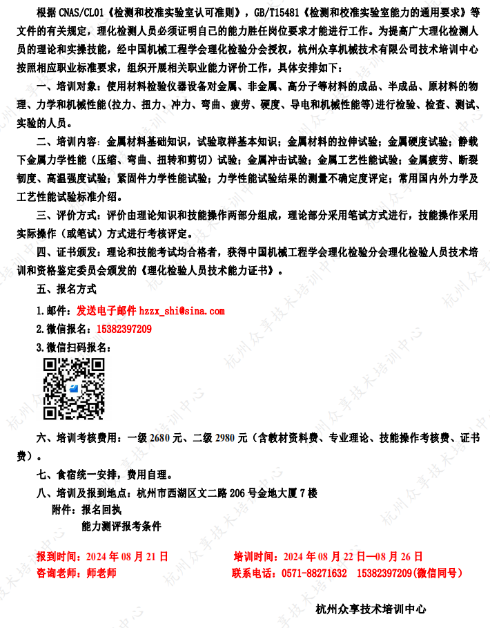 关于2024年08月开展力学性能检验人员职业能力评价工作的通知